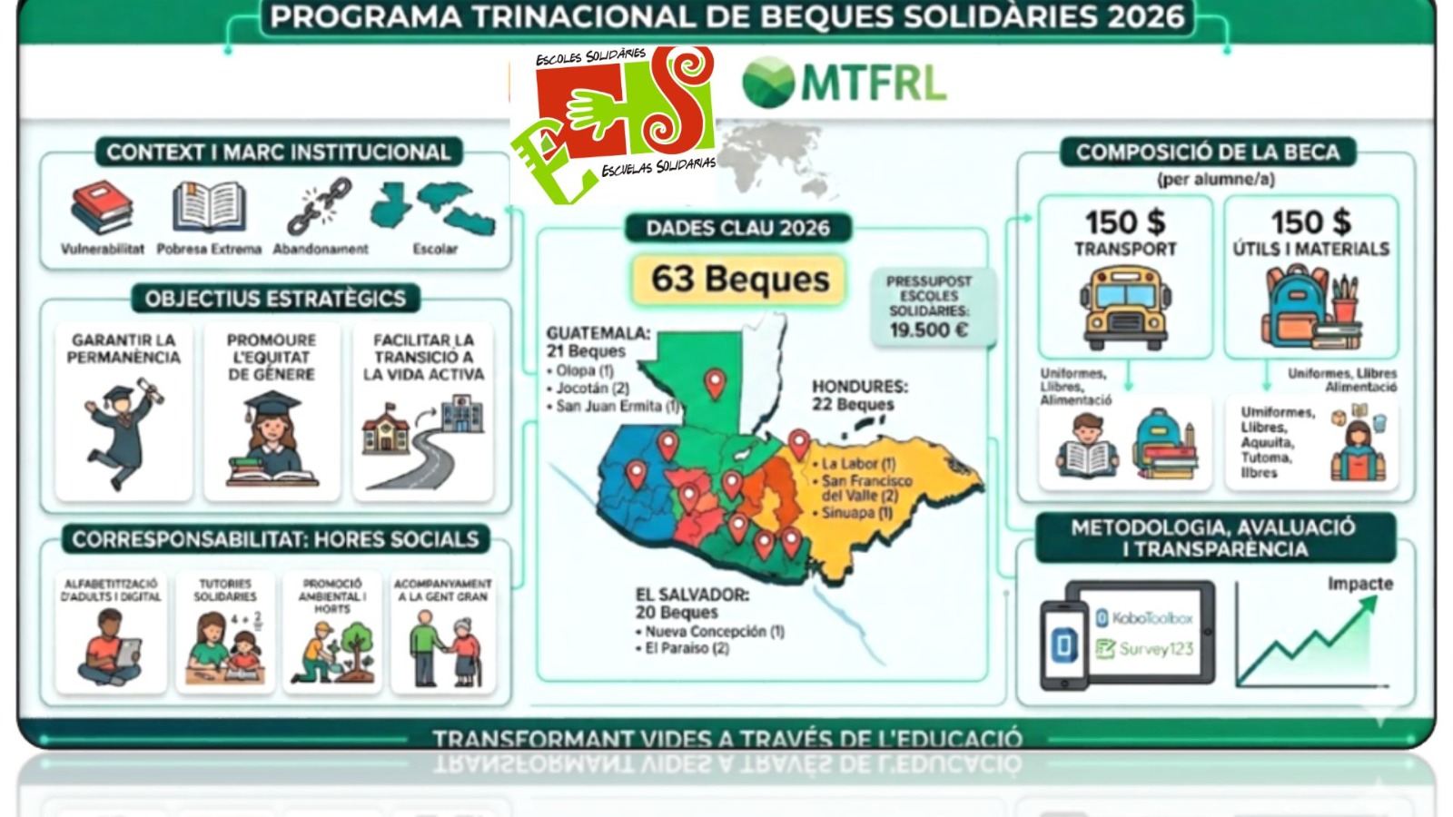 El programa de Beques Solidàries és un projecte destinat a becar als millors alumnes de les comunitats de la «Mancomunidad Trinacional Fronteriza del Río Lempa» que abasta una zona de Guatemala, Hondures i El Salvador.